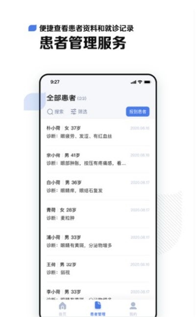 【患者管理】医生可以对在线复诊、线下报到的患者进行备注分组和诊后跟踪病情;