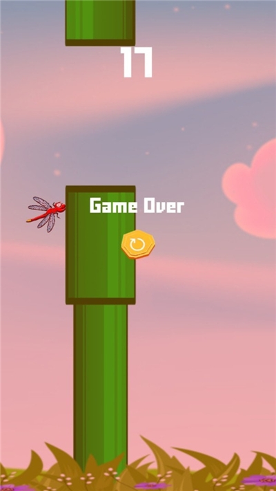 3.游戏的得分是,蜻蜓安全穿过一个柱子且不撞上就是1分。当然撞上就直接挂掉,只有一条命