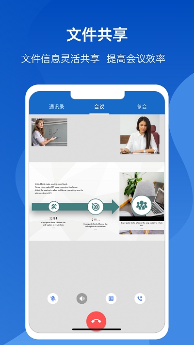 在功能方面,该APP主要包括:组织架构、视频呼叫、响铃式接听、分屏模式设置、文件共享同步查看、云平台参会等。