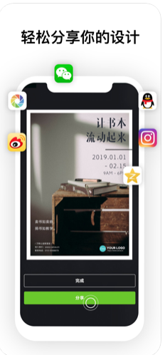直接分享到你喜爱的社交媒体帐户,或者,将你的设计保存到相机相册中并通过电子邮件、短信等进行分享。