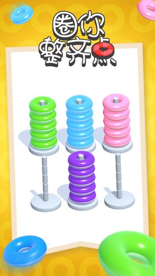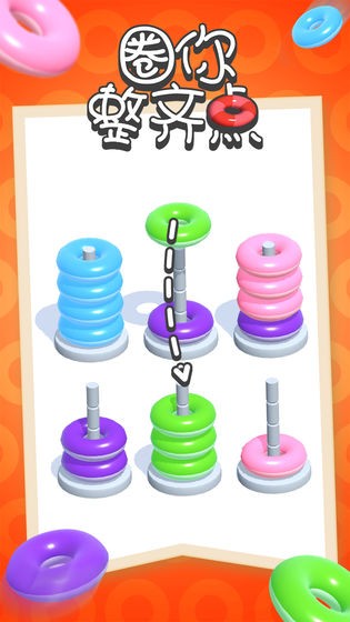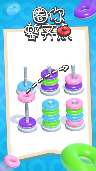 圈你整齐点游戏的目标是将所有圆环都整理归类,玩家需要动动手指将相同颜色的圆环都放在同一根柱子上。随着关卡的升级,游戏难度也会有所提升,发现规律能有效提升通关效率!