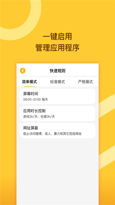 时间管理大师软件app可以帮助用户来对自己每天玩手机的时间进行管理,软件自带了三种模式,简单,标准以及严格模式,用户可以根据自己的实际情况和需求来选择对应的模式,设置可以自由使用手机的时间,然后让软件帮助监督,从而戒掉依赖手机的坏习惯,合理规划自己的时间,如果有朋友感兴趣的话,可以下载时间管理大师软件app进行体验!