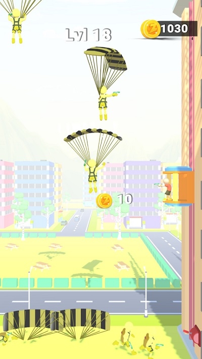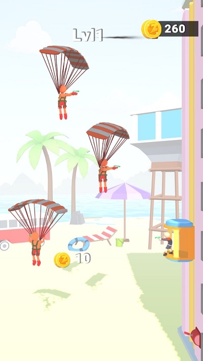 一款非常考验玩家反应能力的闯关类游戏。全部不能掉下来游戏中,你需要把降落的降落伞的敌人们统统击落,你要靠一定的预判能力才能精准的击落敌人,随着不断的闯关你需要应对的敌人会更多,他们的降落速度也会加快。