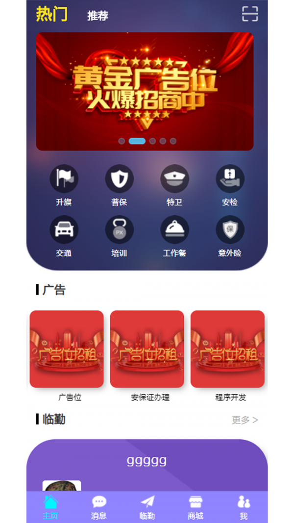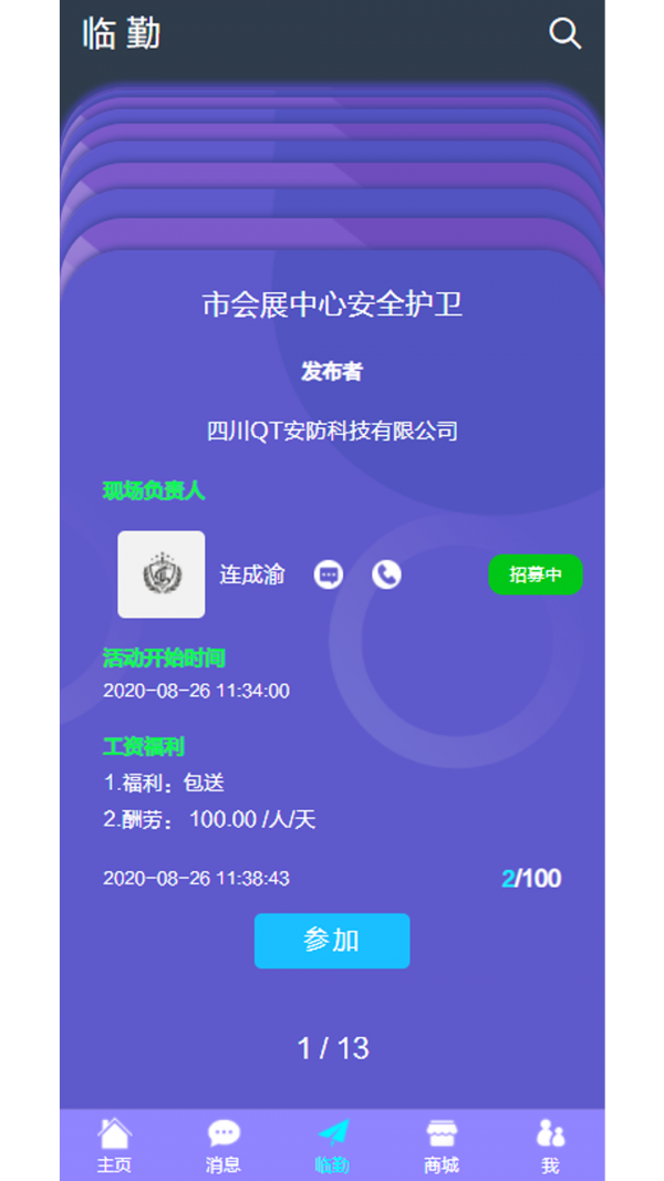 临勤app为安保公司、队长、队员提供 临时勤务服务,从发布活动到招募,结算,人力资源管理为用户提供更准确便利的服务,并根据大数据推荐出更合适活动与人员安排。