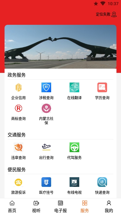 “便民服务”版块包括政务服务、交通服务、便民服务三项,可办理“社保”“商标查询”“医疗挂号”“有线电视”“电费缴纳”“出行票务”等业务,让群众少跑腿成为现实。