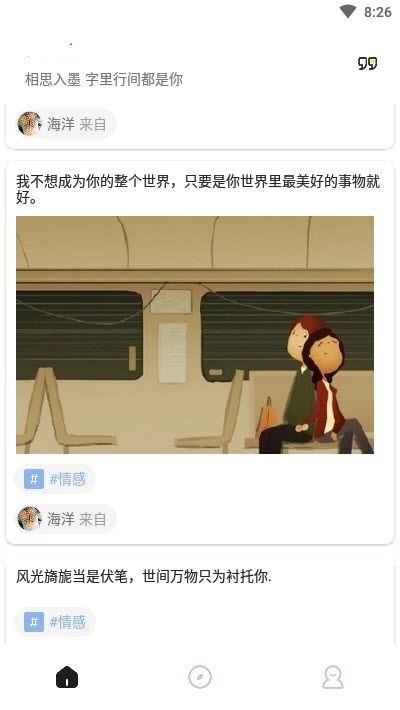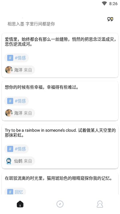 2、整个界面是非常简单的,让你可以轻松找到自己喜欢的句子、图片,给人一种非常舒服的感觉。