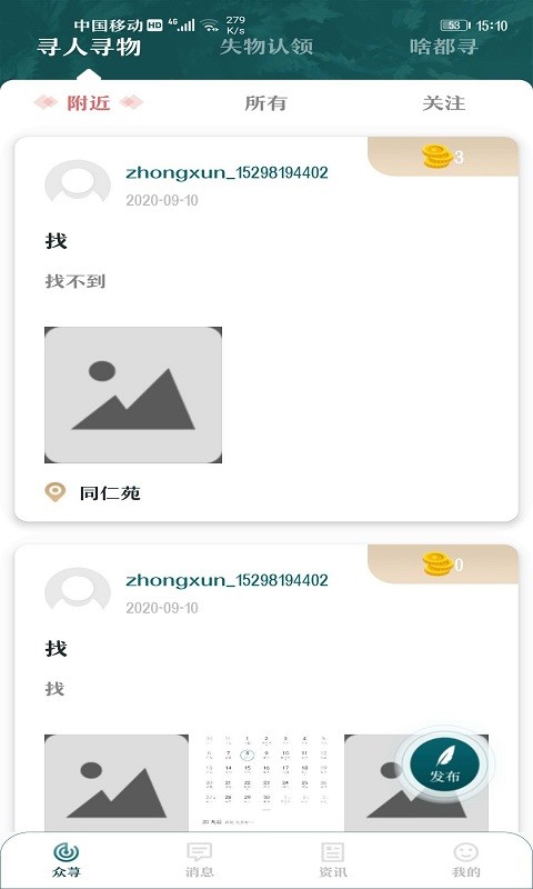 众荨是今天小编带来的一款非常实用的寻人寻物软件。利用这款app,用户可以在线上发布寻物或者寻人启事,有偿寻求帮助,其他用户可以帮助一起寻找,提高寻回的成功率,为小伙伴们提供了最便捷高效的服务体验。