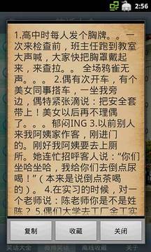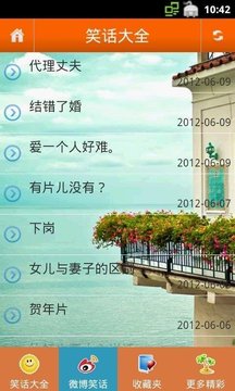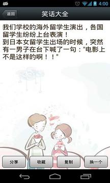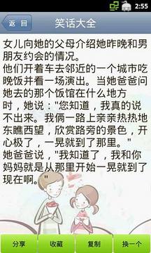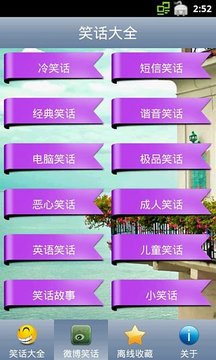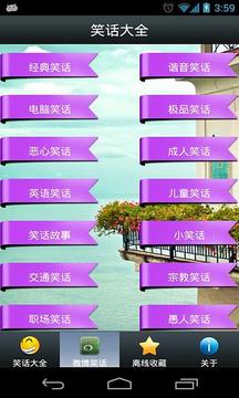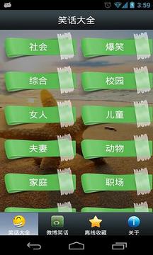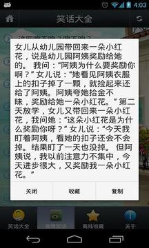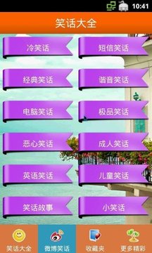 笑话大全是一款聚合大量笑话内容的应用,是目前市场上分类最多的笑话软件,笑话内容在线实时更新,后台专用接口,有效减少传输数据量,增加了本地离线收藏夹功能,只要添加到收藏夹,就可以离线浏览,还有复制转发功能。用心打造最大最全的网络笑料,希望笑话大全能给您带去轻松快乐的心情!