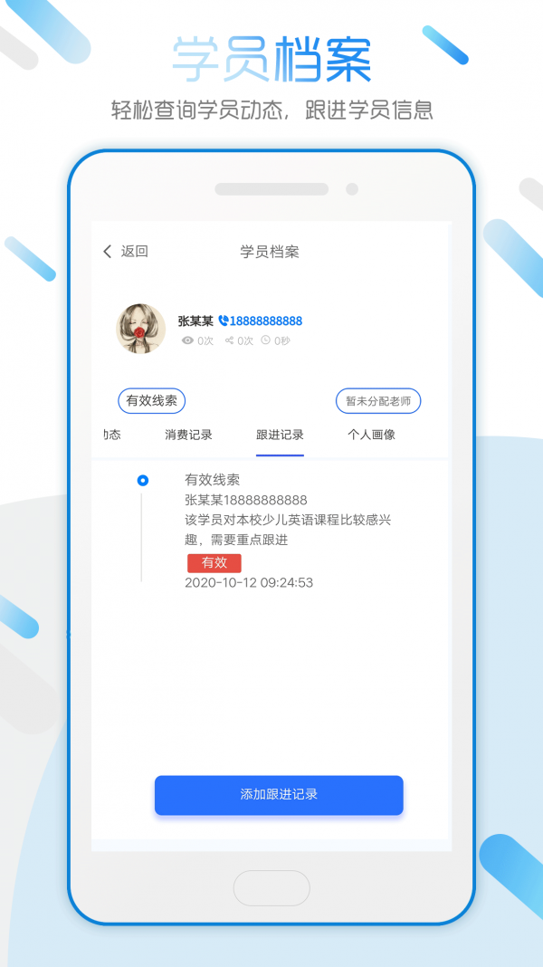 招生雷达app是一款线上招生,学生管理以及老师管理的一款app。校长可以管理老师与学生,并且可以将学员分配给指定的老师。老师可以对学生进行操作,添加跟进记录等,学生信息同步到校长端,并且老师的操作行为也会更新至校长端。