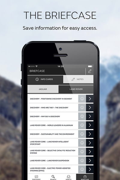 信息分为针对每个车辆系列和核心品牌特征的作品集,并以多种吸引人的方式呈现信息。全文中均包含短片,解释了关键主题。也可以从每个作品集的“相关视频”区域中访问这些视频。知识渊博的专家出现在视频中,例如Ben Collins,Top Gear的前Stig,Vicki Butler Henderson(赛车手和电视节目主持人),Justin Bell(赛车手)和Lorraine McKiniry(电视节目主持人)。通过各种活动与内容进行互动,包括滑动以显示更多,热点以及Jaguar Land Rover车辆及其竞争对手的360°内部和外部视图。