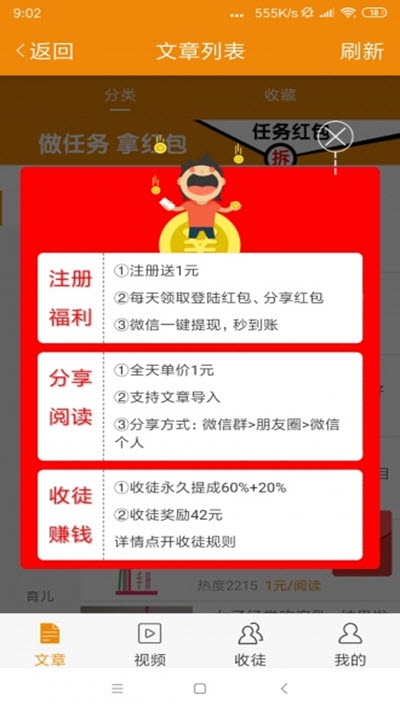 新人下载就送1元奖励至余额内,转发文章单价全天1元,支持用户上传文章和视频转发