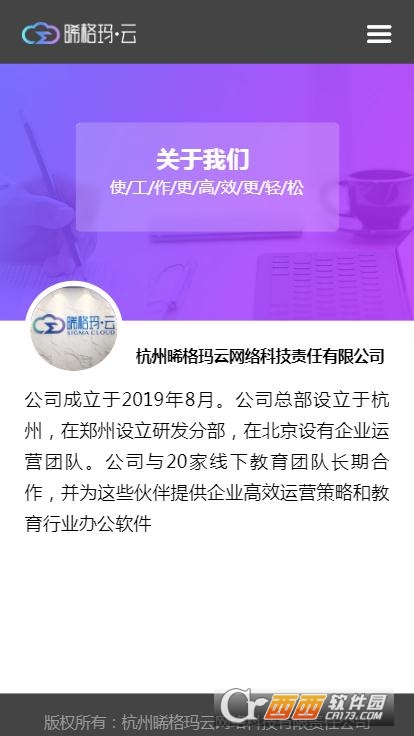 杭州晞格玛云网络科技责任有限公司成立于2019年8月。公司总部设立于杭州,在郑州设立研发分部,在北京设有企业运营团队。公司与20家线下教育团队长期合作,并为这些伙伴提供企业高效运营策略和教育行业办公软件。