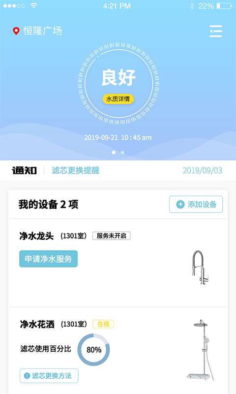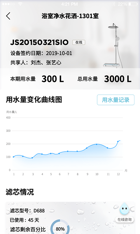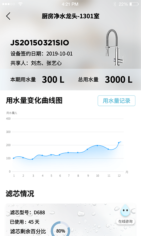 2、实时了解滤芯消耗百分比,享受配送滤芯到家服务