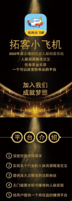 拓客小飞机app是一款全新的推广赚钱平台。拓客小飞机app主打线上赚钱新体验,全新的赚钱之旅,一站式满足你的指尖赚钱所需,开启一场专属于你的指尖赚钱新篇章,让你奖励拿到手软。