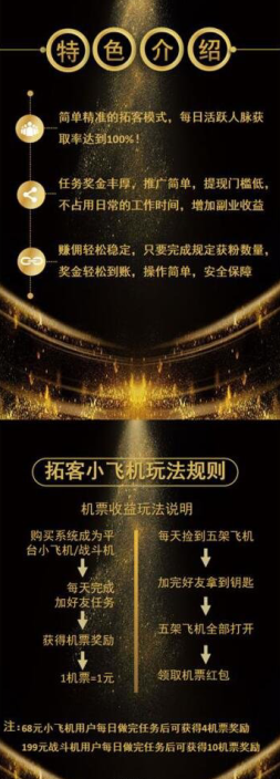 花费68元/199元(拓客小飞机/战斗机)购买拓客系统后,每天完成加好友任务后,可获得机票奖励,1机票=1元