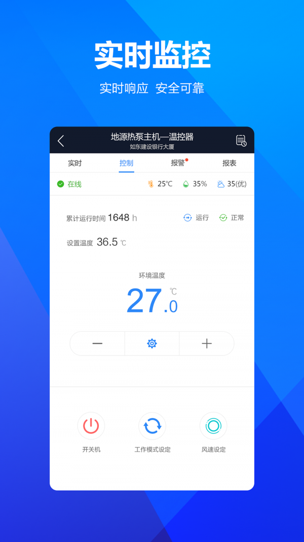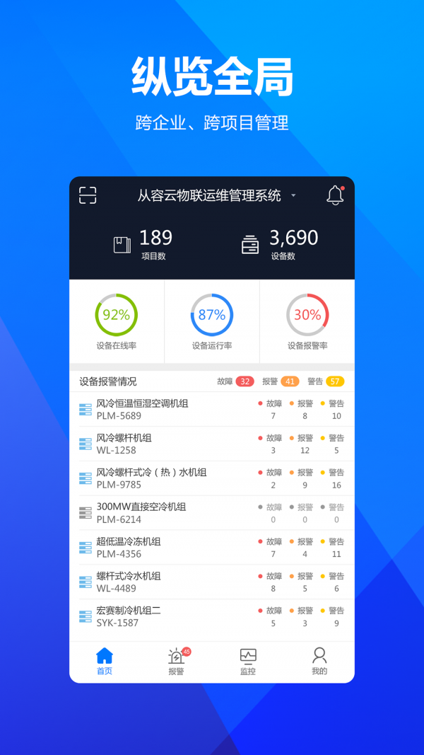 本应用集合实时数据监测、远程控制、预警预报、报警快照、预警分析、离线记录、数据报表等功能,是一款设备运维监控的移动应用软件。 本应用支持多企业切换登录,支持多用户不同角色的权限控制,且支持多个项目的集中监管。