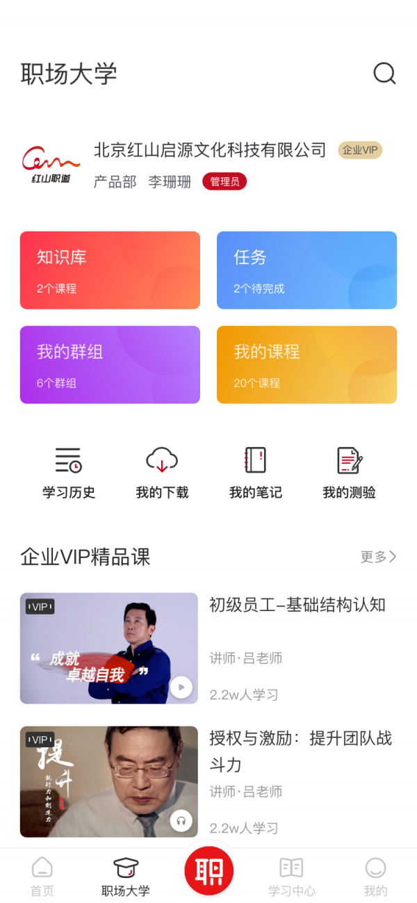 红山职道APP,专注在线职场学习一体化解决方案,提供覆盖从入职前,到职场新人、初级管理者、中高层管理者的职场进阶产品集群,打造专业的在线职场学习平台。我们以“锻造人力资源,提升人才价值”为使命,在满足个人提高竞争力的同时,有效解决企业的用人效率,致力于做校园到职场的连接纽带,成为一所伴随工作人生的“职场大学”。