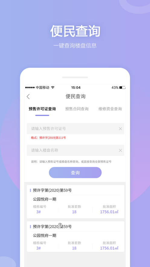 3、其中包括的主要功能有:楼盘查询、一房一价、便民查询、地图找房,我们致力于为您提供更好的房产信息服务。