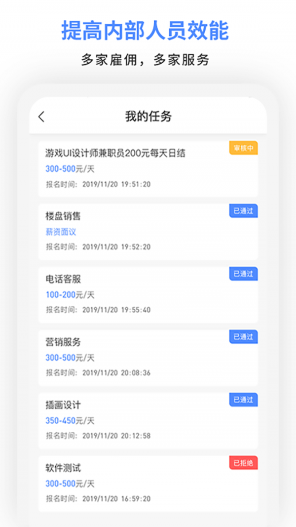 秉承合法合规、科技创新、专业高效的精神,致力于科技解决人才共享,打造共享经济综合智能服务平台。