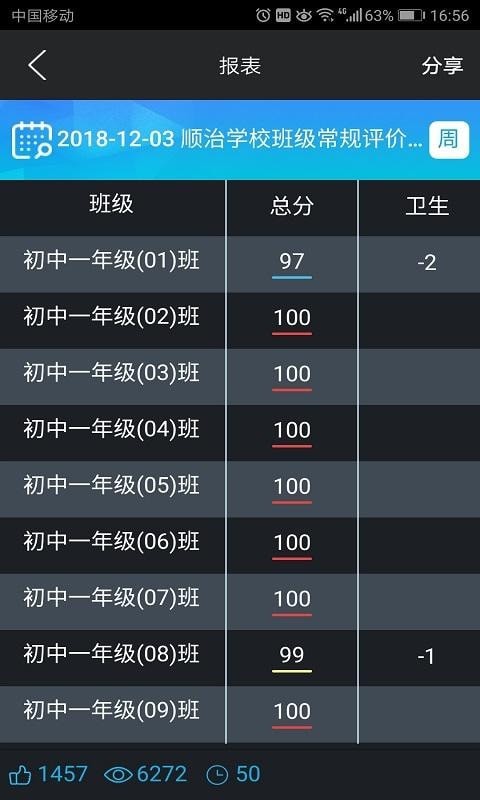 值周检查考核报表可直接发布到班牌、手机端,加扣分记录事件可实时推送到班牌,即记即现,最快速度促进行为改进。