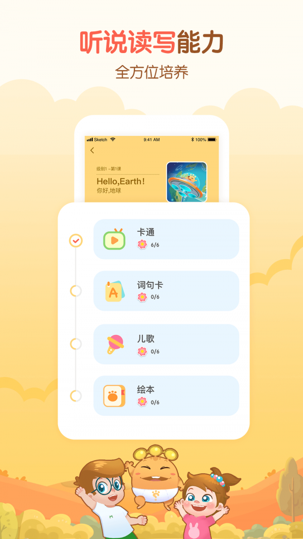 课程内容紧贴剑桥少儿英语考试考纲,课程难度设置呈螺旋式上升,孩子阶梯式进步看得到!学完所有级别,孩子可轻松通过剑桥KET考试,是计划让孩子考级的家长必备神器!