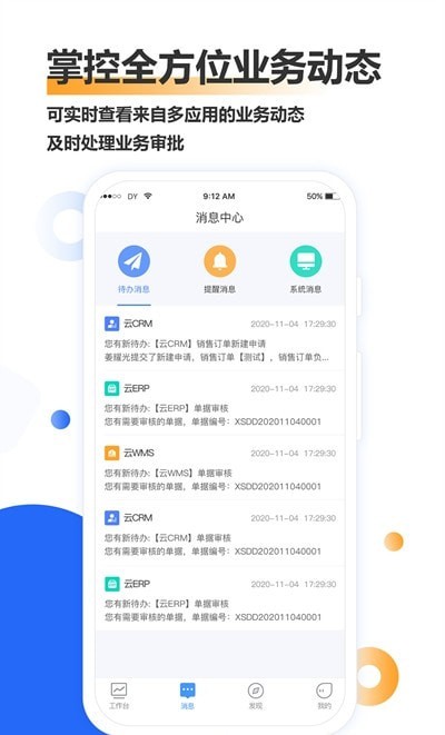 可以实时查看多个应用的业务动态,及时处理业务审批,随时获取相关的业务分析和管理数据