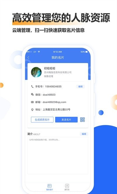 云管理,扫描快速获取名片信息,掌上随时管理和处理您的业务。