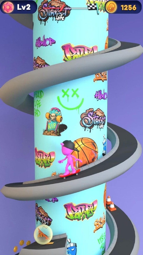 游戏画面十分精致卡通,在游戏中玩家会体验到十分有趣的滑板冒险游戏玩法,在游戏中你需要沿着一条螺旋状的赛道一路的奔跑,游戏操作家的男易上手, 沿途会有各种各样的敌人阻碍你的前行,你需要时刻小心。