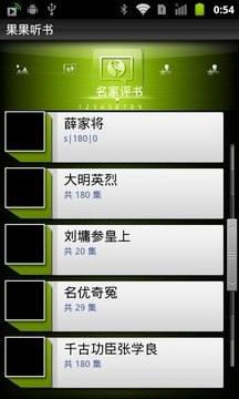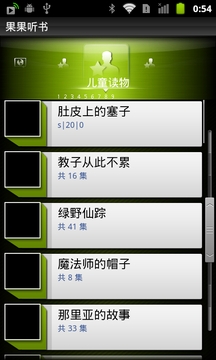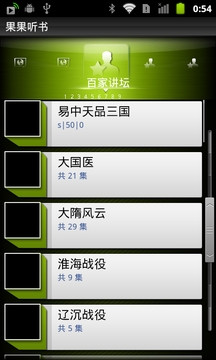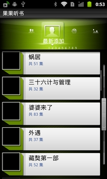 书看多了,眼睛容易累;网逛多了,容易倦.这时候,我们不妨换个方式来阅读,那就是最特殊最新潮的听书.如果你真的很懒,或者你是有车一族,而恰巧正堵在了路上,那么果果听书是你最好不过的选择了,随时下载,随时听书,即可消磨时间,又可增长知识.内容超级丰富,有有声读物大全,上千部内容,有声小说,百家讲坛,名家评书,精品相声,儿童故事等等,欢迎大家反馈问题,谢谢.