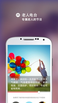 全国首款针对老年人使用的听的应用,您在也不用担心爸妈老花看不见了,爸妈也不用每天提着个收音机满世界跑了 ,只要手机不坏,“老听”就常在!给爸妈安装一个“老听”就是给爸妈最好的礼物。