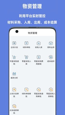 4、具体的物资管理功能,涵盖主材计划、材料申购、采购入库、领料出库、零星采购等