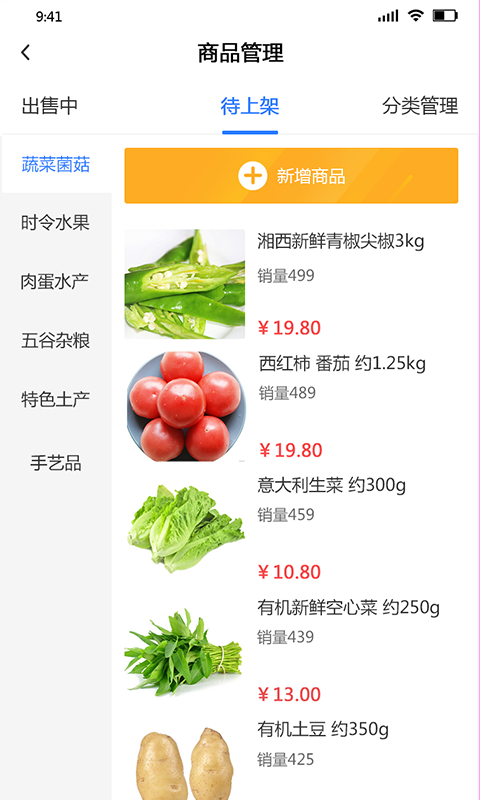 1、具有多种商品管理栏目,这里面划分了出售中、待上架和分类管理三个栏目