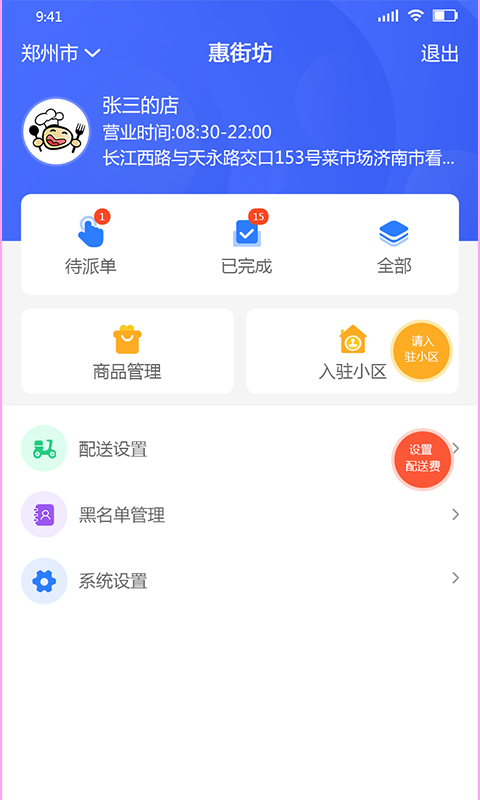 3、有多元化的设置功能列表,其中包含配送设置、黑名单管理和系统设置功能