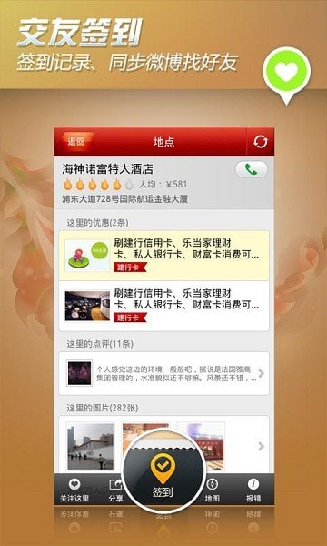 4.签到分享:签到记录足迹,同步sns微博、开心网和更多的朋友分享