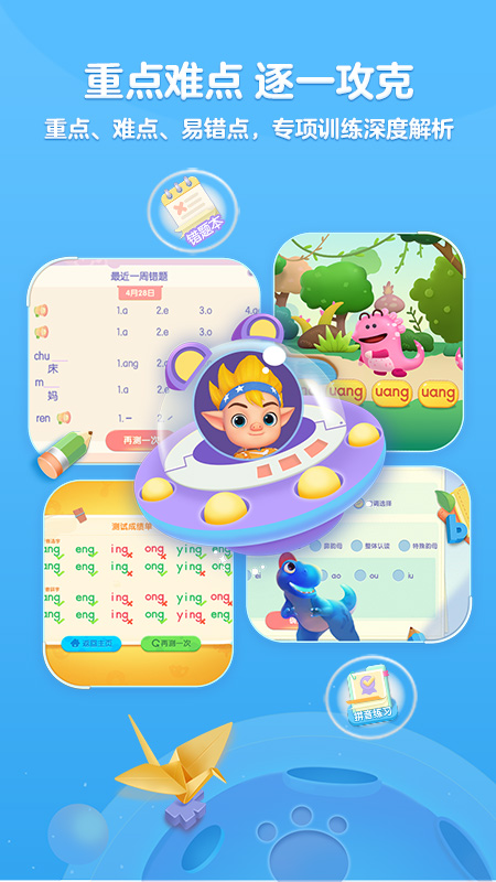 针对拼音音形设计独有的创意交互环节,玩、认、调、读、说、拼、练、写、测9大教学环节,让孩子关联记忆高效学习。