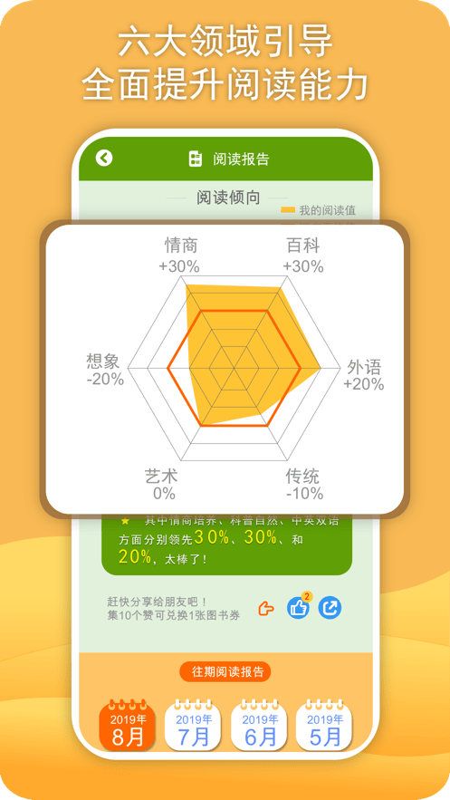 1.直观的《阅读报告》从6大领域引导学生均衡阅读,陆续上架68类兴趣方向的中外优秀作品,是有声图书的王国