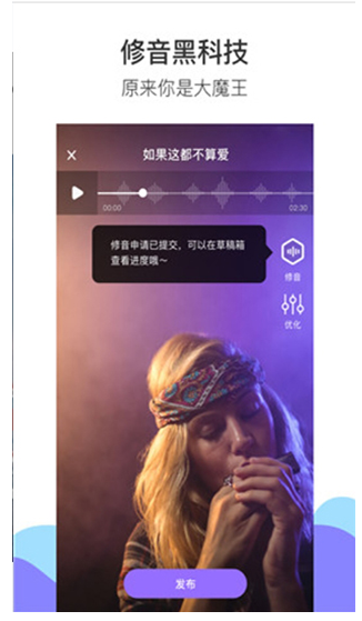 专业的混响,多种主题的背景,强大的修音功能,让你能够把简单的哼哼变为天籁之音,野花视频app让你想唱就唱,不需要顾忌太多东西,让你有勇气开口唱下去。修生技术更强大,让你能够把自己五音不全的歌曲变为另外一种风格,让你更自信。