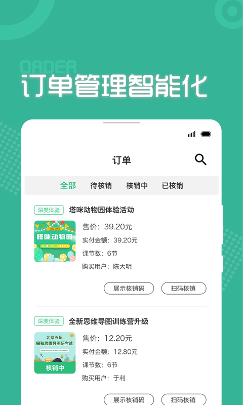智能管理包含待核销、核销中、已核销全部状态的订单,让机构一手掌握课程销售情况