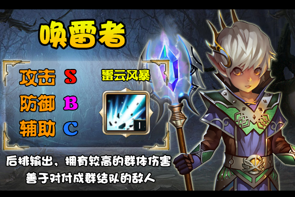 唤雷者为典型的群攻型DPS英雄,其自动技术与肝火技术均为群体危险,而在这此中肝火技术雷云风暴更是针对敌方全部形成危险的。他的主动技术更是大幅度晋升本身的进犯危险。但注重因为本身进攻懦弱,建议放在肉盾死后。