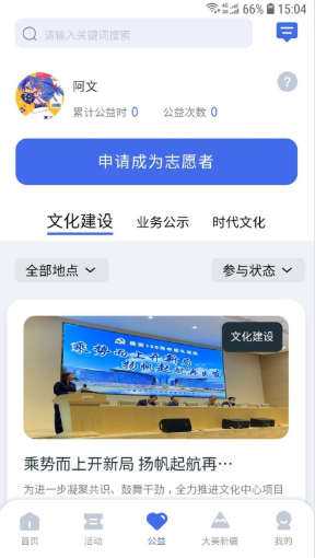 3.软件中也有良多可以开启自愿者介入的各种文明扶植活动,在线的开启公益活动的报名介入,让用户取得非常好的软件运用体验。
