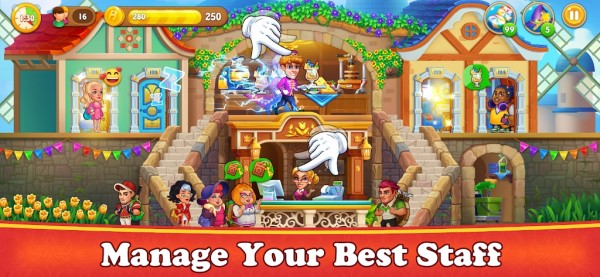 玩家在酒店日记中成为一名酒店经理,你需要好好建设自己的酒店,一点点升级壮大自己的规模,提高楼层数增加房间数量,这样就可以容纳更多的客人,而且还要招募更多的服务员,为顾客提供更好的服务!