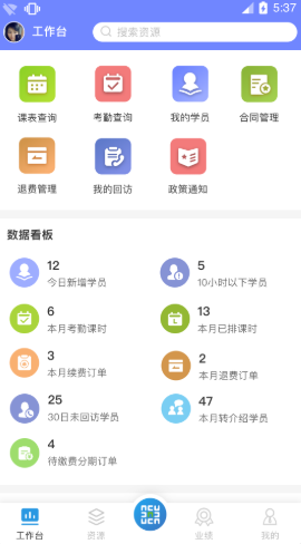 3、为用户供给了课表查询、考勤查询、在线学员、条约办理、退费办理、用户回访和政策告诉等等的性能信息,性能非常的厉害。