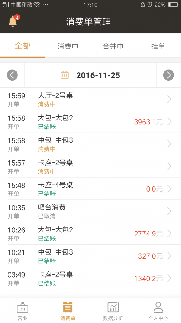 2、平常营业办理,开单、包间预订、结账消费、吧台消费、员工交代班;