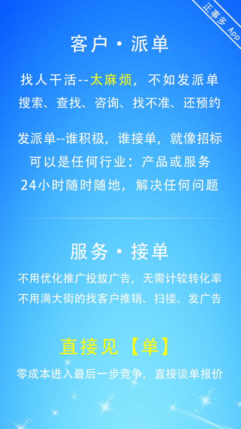 正事多软件是专门的线上接单服务软件,该软件的主要功能是给用户提供全面的派单服务,用户使用起来非常的方便,强大的功能和性能在这块有着非常不错的表现,用户可根据自己的需求来使用,随时可以在线接单,附近有什么人需要干活的都能提供给你,可满足用户在这块的一切需求,非常的实用给到用户最完善的使用体验,快来下载试试吧。