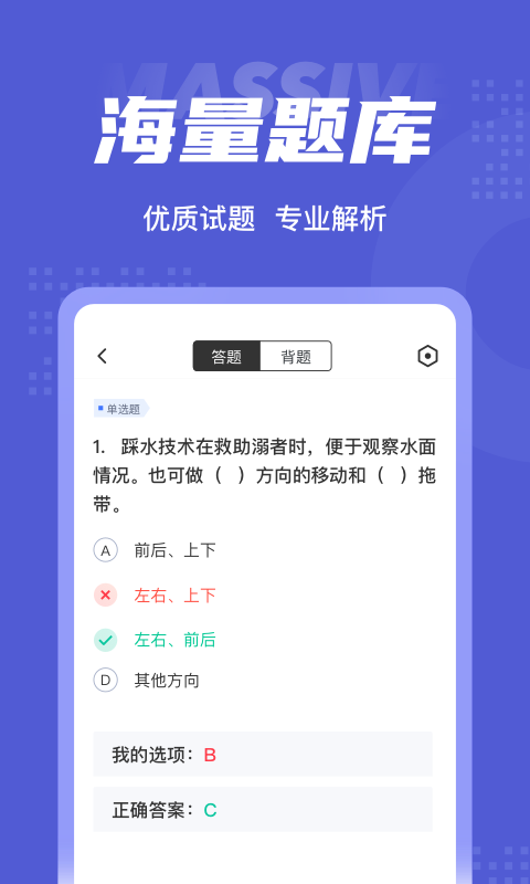 游泳教练题库内含考点练习,全国通用卷以及地区卷模拟练习,以及根据固定考试比重的随机式的抽题的真题考场,成绩单实时记录考试数据,一点一滴的反馈考生近期学习状态以及自我正确率的提升,大大的给予考生通过考试的信心