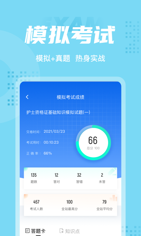 护士资格证题库内含考点练习,全国通用卷以及地区卷模拟练习,以及依据固定考试比重的随机式的抽题的真题考场,成绩单及时记录考试数据,一点一滴的反馈考生近期学习状态以及自我正确率的提高,大大的给予考生通过考试的信心