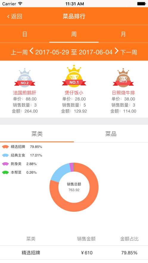 每一道菜品或每一类的销售统计,帮助商家依据用户的口味改进自己的菜品,也给开发新菜品提供依据,检验菜品的唯一的标准就是市场,顾客是最有发言权的评委,老百姓认可的莱就是好菜