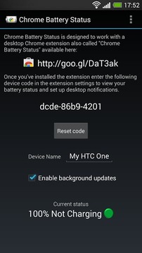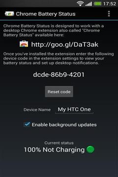 Chrome battery status is designed to work with a Chrome desktop extension (plugin for chrome desktop) also called "Chrome Battery Status" available from the Chrome Web Store
