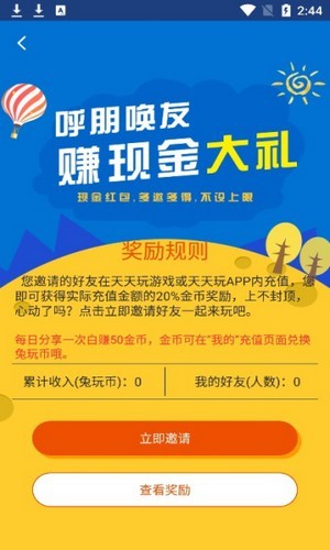 3、你邀请好友在天天玩游戏或者天天玩app内充值,你能够获取实际充值金额的20%金币奖励
