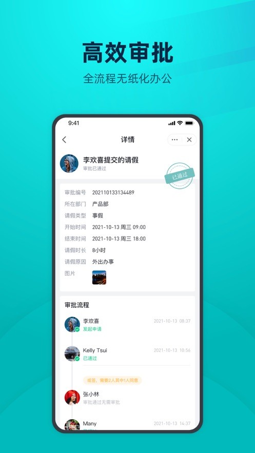 管理人员能随时随地登录系统,不再局限于办公室,打破空间限制。员工更可透过手机APP进行考勤打卡,请假、费用申请,查看公告、排班、工资单等信息,操作简单便利
